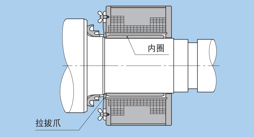 對于小型軸承,可采用如上圖所示的拉拔夾具將軸承拉出,但如果能夠采用如下圖所示的專業拆卸夾具,以壓出的方法壓出軸承,則更佳,下圖的工具,不僅不會損壞軸承,而且工作效率也更高。