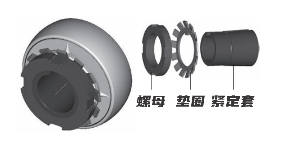 二是通過緊定套安裝到軸上。如上圖所示,緊定套及螺母鎖緊,將外球面球軸承安裝到軸上。