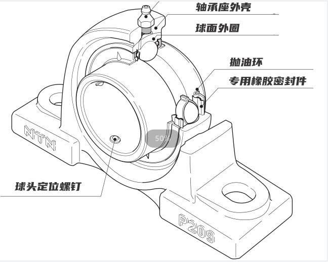 外球面球軸承的內部結構應確保使用與NTN深溝球軸承62、63系列中相同類型的鋼球和護圈,雙面密封由耐油合成橡膠密封和拋油環組成。