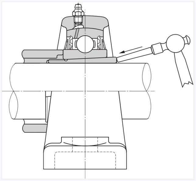 二、放置軸承裝置,使錐形孔正確定位在套筒上,并使圓柱套筒緊靠內(nèi)圈的鎖緊螺母側(cè)面,如上圖所示,在其整個外圍輕輕敲擊適配器套筒,直到軸承和套筒之間形成正接觸。