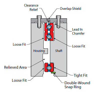 當角接觸軸承作為配對購買時,稱為“雙聯配對”,內圈和外圈只需夾緊到位,如上圖所示,對于具有軸向預緊的軸承,軸承與軸和殼體之間應留有微小間隙。SKF通常不建議在同一軸上使用兩個背靠背(DB)軸承對,如果在長軸的另一端使用第三個軸承,則應為單徑向或面對面(DF)配對軸承,同時還應能在軸向自由浮動。