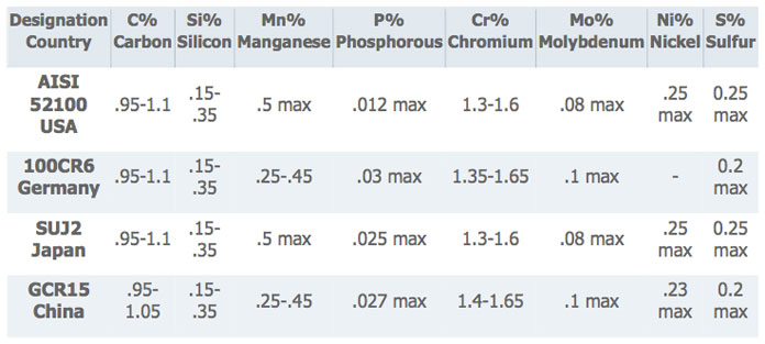 超凈52100鉻鋼是一種優(yōu)秀的通用軸承鋼,由于其優(yōu)異的硬度和耐磨性,由此制成的滾動(dòng)軸承具有良好的疲勞壽命,然而,由于鉻含量低,鉻鋼的耐腐蝕性較差,軸承表面必須涂上防銹劑或油以防止氧化,下表是在不同國(guó)家生產(chǎn)的軸承鉻鋼標(biāo)準(zhǔn)化學(xué)成分,以供參考。