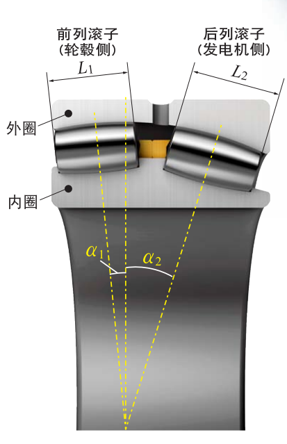 我們可以清晰地看到,后列滾子與滾道的接觸面,要大于前列滾子,由于受力傳遞,后列滾子與外圈有較大的載荷,而內(nèi)圈前列滾子一側(cè),會受到來自后列滾子的軸向壓力,因此才有了上圖所示造型。