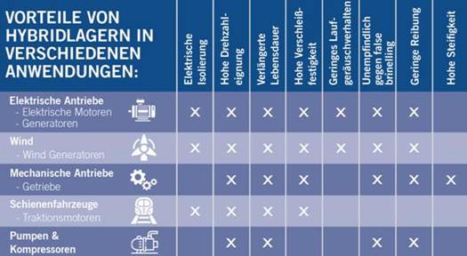 通過使用氮化硅制成的滾動元件,軸承的使用壽命在其他應用中也會顯著延長,下表概述了最常見的混合陶瓷軸承應用和軸承的優點。