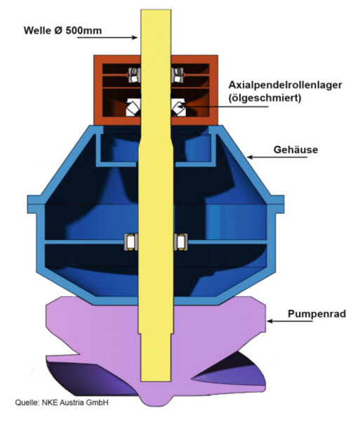 在大型冷卻水泵(混凝土螺旋泵,即具有垂直軸和鑄造混凝土外殼的離心泵)的測試運行期間(下圖所示),驅動側軸向軸承的允許運行溫度被反復超過,導致其自動停機,仔細檢查后,發現是由于不適合此應用的潤滑油造成的,此處使用的是純液壓油,其成分(即添加劑)和粘度均不符合軸承的要求。