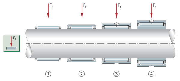 徑向承載能力——深溝球軸承/圓柱滾子軸承的比較 ①深溝球軸承–徑向承載能力較低 ②圓柱滾子軸承NU系列–徑向承載能力更高 | ![]() |