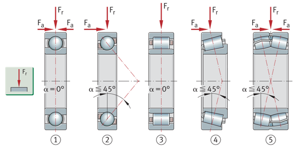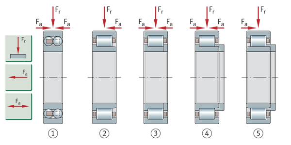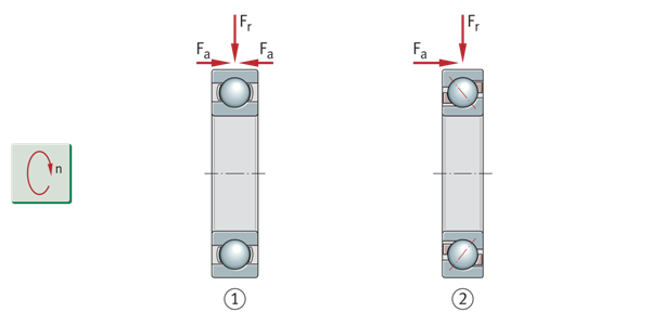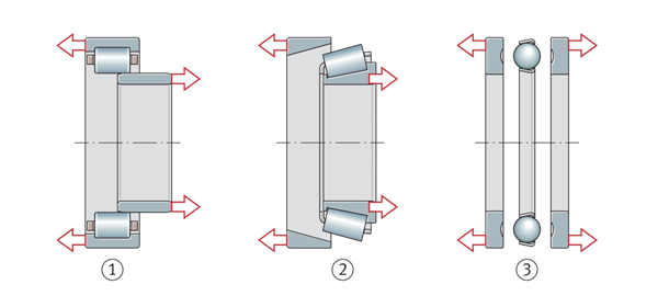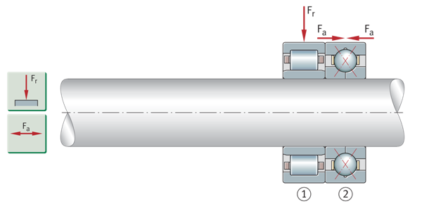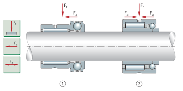 一個方向上存在的軸向載荷只能由單列角接觸球軸承和圓錐滾子軸承、圓柱滾子軸承NJ以及NU+HJ和軸向調心滾子軸承支撐。對于交替的負載方向,這些軸承必須始終與第二個軸承一起安裝(第二個軸承必須在相反的方向上提供支撐)。對于成組安裝,可使用配對的單列角接觸球軸承或由兩個單個軸承組成的匹配圓錐滾子軸承組。