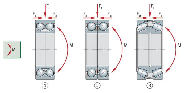 用于支撐傾斜力矩的軸承 M=傾斜力矩 ①雙列角接觸球軸承 ②角接觸滾珠軸承組,包括兩個匹配的單列角接觸滾珠,O型配對 ③圓錐滾子軸承組,包括兩個匹配的單列圓錐滾子軸承,X型排列 | ![]() |