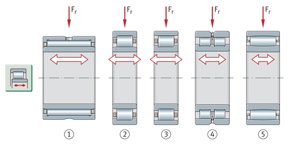 用于軸承內補償的非定位軸承 ①滾針軸承 ②圓柱滾子軸承NU ③圓柱滾子軸承N ④圓柱滾子軸承SL0248 ⑤環形滾子軸承 | ![]() |