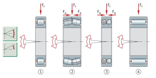 用于靜態和動態錯位補償的軸承 ①滾子軸承(非定位軸承) ②調心滾子軸承(定位軸承) ③調心球軸承(定位軸承) ④環形滾子軸承(非定位軸承) | ![]() |