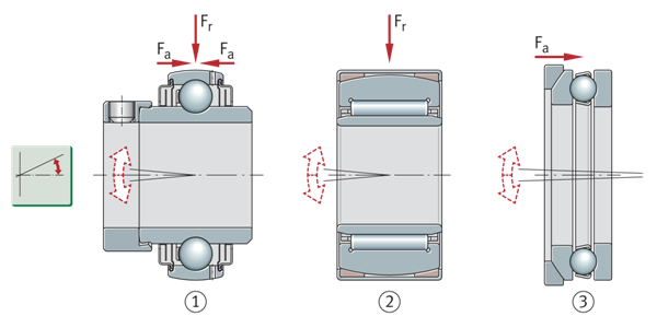 如果軸和殼體之間發生偏斜,例如,如果軸承座未對齊,軸在負載下變形,或者軸承位置相距相當大的距離,則必須通過適當的軸承(自對準軸承)進行補償。如果使用了單獨的外殼,如軸承座或法蘭外殼,也應預計會出現錯位。類似的影響(軸承位置的對準不準確性)是由滾動軸承環的徑向座表面和橫向接觸表面之間的角度缺陷引起的。