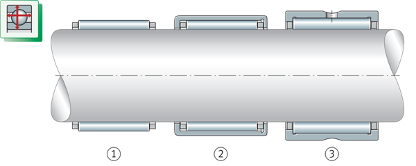 滾針和保持架組件必須軸向引導和定位。可通過軸或外殼提供導向。卡環或適當設計的相鄰結構適用于此目的。如果通過卡環或擋圈進行定位,則必須在卡環前面布置一個墊圈,環和墊圈之間的重疊必須足夠大。
