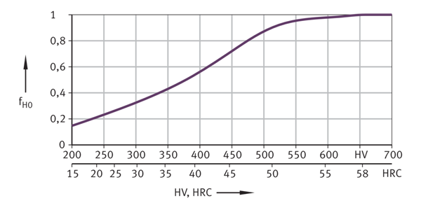 如果滾道滿足滾動軸承材料的要求,但滾道硬度小于670 HV,則軸承布置上的載荷不能高達軸承的全承載能力。為了確定軸承裝置的動態和靜態承載能力,軸承的基本動態額定載荷C必須乘以折減系數fH(動態硬度系數),基本靜態額定載荷C0r乘以折減因子fH0(靜態硬度系數)