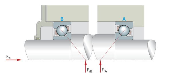 調整后的軸承布置 具有兩個X形排列的單列角接觸球軸承,外力 Ka=作用在軸承上的外部軸向力 FrA=徑向載荷,軸承A FrB=徑向載荷,軸承B | ![]() |