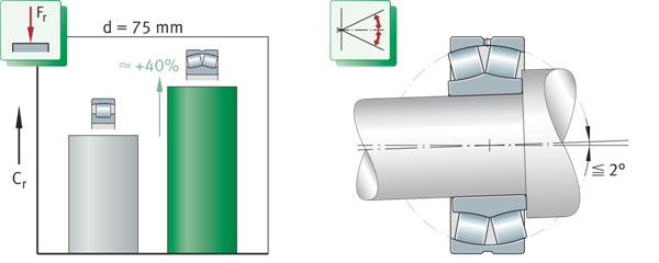 調(diào)心滾子軸承: 與同尺寸圓柱滾子軸承承載能力的比較及誤差補(bǔ)償 Fr=徑向載荷 Cr=基本動態(tài)額定載荷 | ![]() |