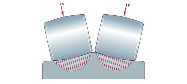 由于優(yōu)化了滾子和滾道輪廓,負(fù)載分布均勻 F=滾子上的負(fù)載 | ![]() |