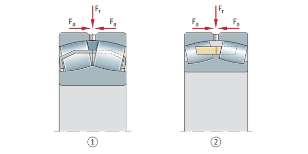 圓柱孔基本設(shè)計(jì)調(diào)心滾子軸承 Fr=徑向載荷 Fa=軸向載荷 ①內(nèi)圈無中心肋調(diào)心滾子軸承 ②內(nèi)圈帶剛性中心肋的調(diào)心滾子軸承 | ![]() |