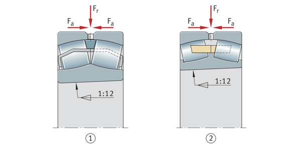 圓錐孔基本設(shè)計(jì)調(diào)心滾子軸承 Fr=徑向載荷 Fa=軸向載荷 ①內(nèi)圈無中心肋調(diào)心滾子軸承 ②內(nèi)圈帶剛性中心肋的調(diào)心滾子軸承 | ![]() |