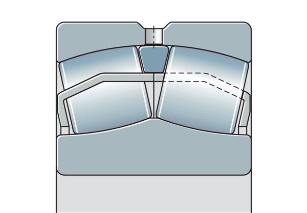 | 一件式鋼制保持架,內(nèi)圈導(dǎo)向,內(nèi)圈有兩個(gè)側(cè)向擋肋和一個(gè)中心肋 | ![]() |