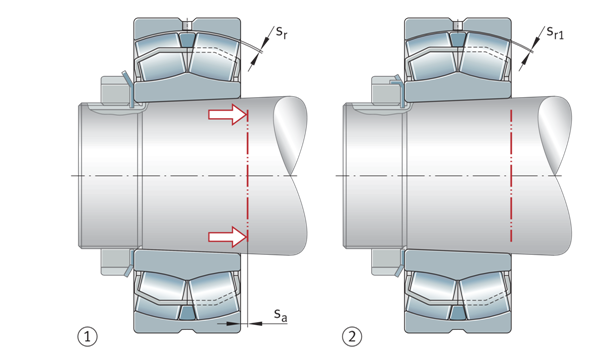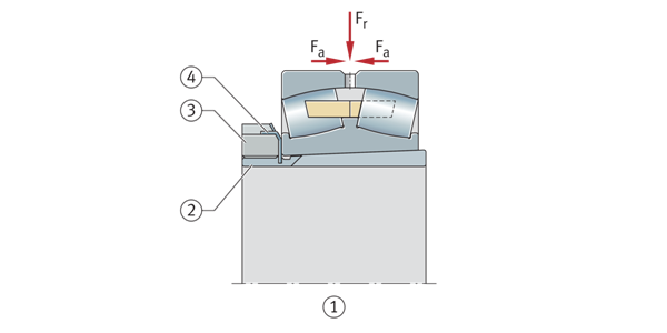 由于其內(nèi)部結(jié)構(gòu),調(diào)心滾子軸承可以承受高軸向載荷。如果帶有緊定套或退卸套的軸承位于沒有固定軸向止動件的光滑軸上(例如剛性臺肩),軸承裝置的軸向承載能力取決于軸和套筒之間的摩擦。