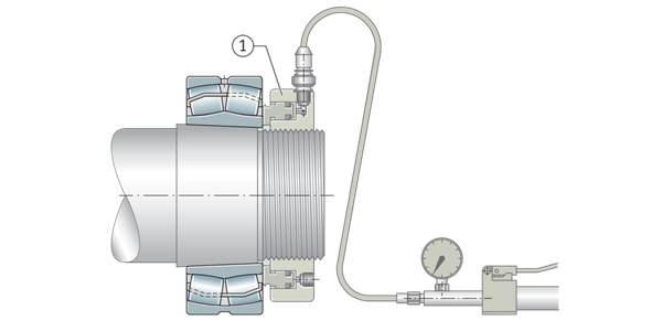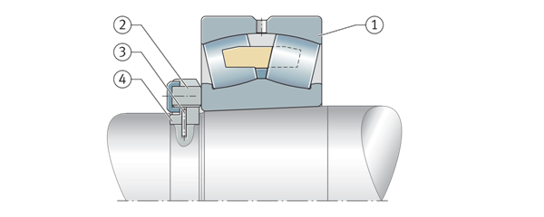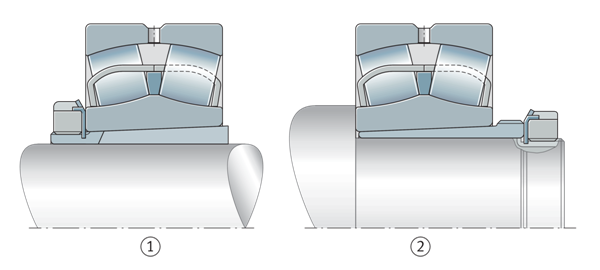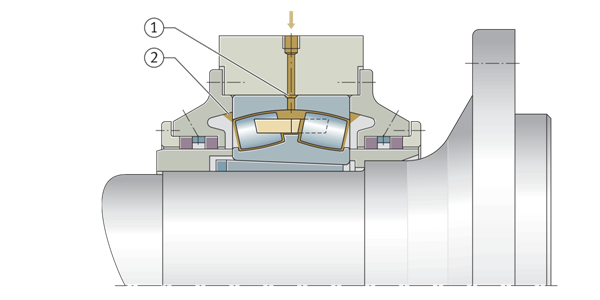用液壓螺母安裝大型軸承 ①帶錐形孔的調(diào)心滾子軸承直接安裝在錐形軸頸上 ②液壓螺母 | ![]() |