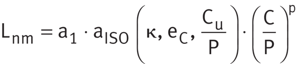 以百萬轉(L10)為單位的基本額定壽命計算以及以運行小時(L10h)為單位的基本額定壽命計算如下: