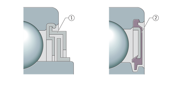 迷宮式密封集成在軸承中 ①帶集成保護迷宮的軸承 ②帶橡膠密封罩的軸承作為保護迷宮 | ![]() |