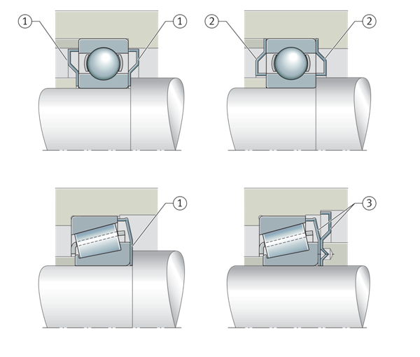 在潤滑脂潤滑軸承的情況下,可以通過使用簡單的擋板來防止固定軸承套圈上的潤滑脂流出。根據安裝和操作位置,板在其外緣或內緣進行支撐,在密封間隙處形成的潤滑脂套環提供保護,防止受到來自外部的輕微污染影響。