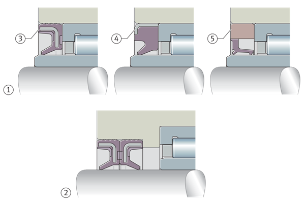 帶密封唇保護的夾層結構唇型密封 ①軸向預緊密封唇 ②徑向預緊密封唇 ③三個徑向預緊的密封唇 | ![]() |