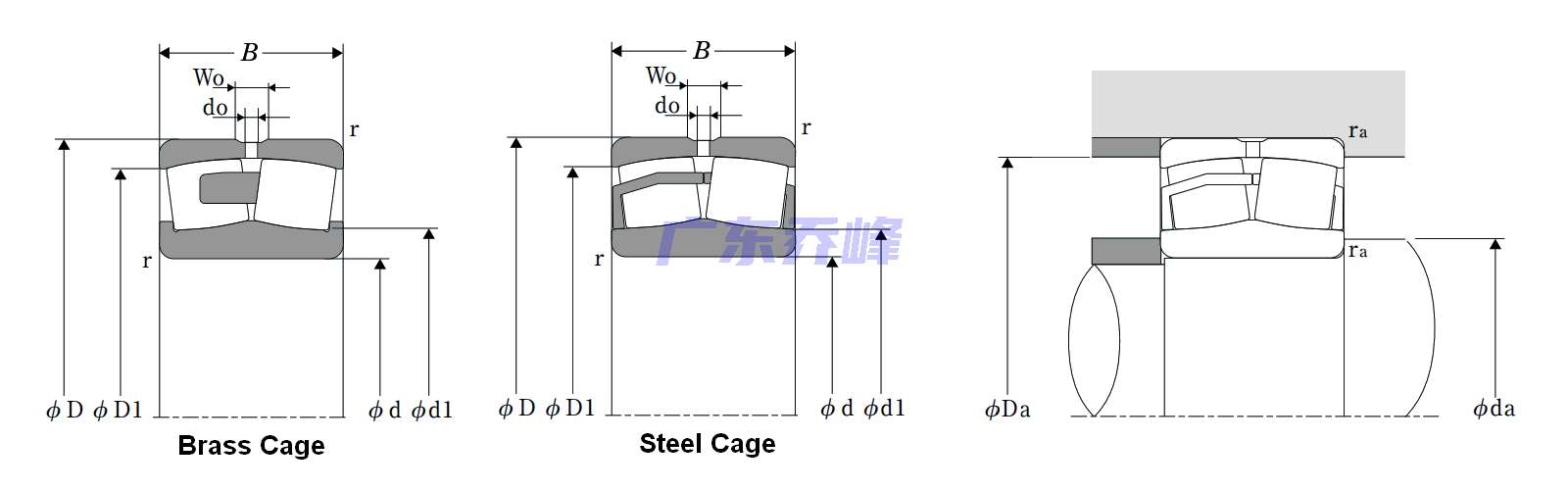 一體式機(jī)加工黃銅保持架,抗沖擊性好,剛度大(B型:每排一個(gè)機(jī)加工黃銅保持架)