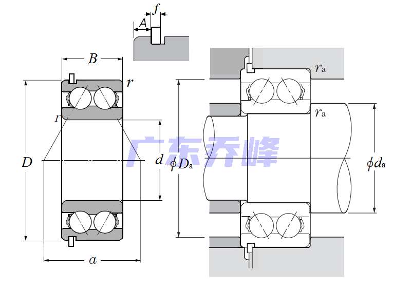 | 雙列角接觸球軸承 - 開(kāi)式帶止動(dòng)環(huán) - 尺寸 | |