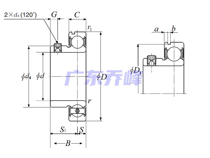 | 帶緊定螺釘的外球面軸承,狹窄內圈 - 圓柱內徑,帶止動環槽 - 尺寸 | |