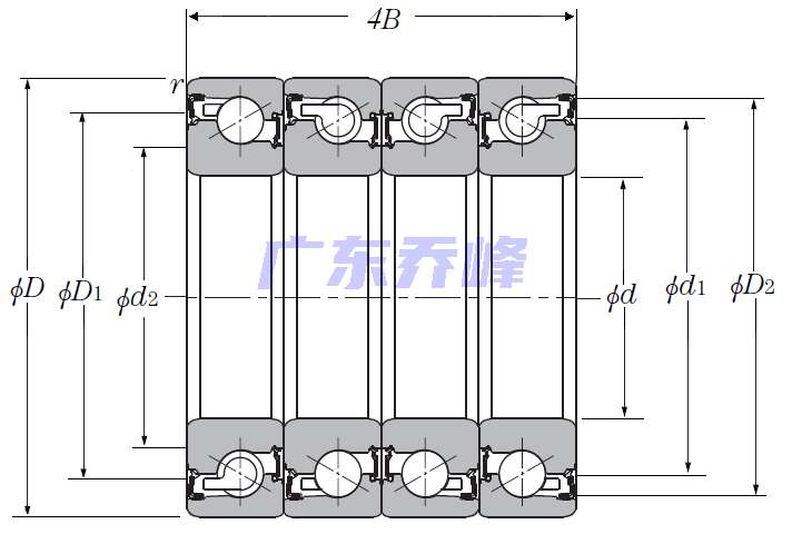 | 滾珠絲杠用四列角接觸推力球軸承 - DTBT配對,雙面密封,兩排承受軸向載荷 - 尺寸 | |