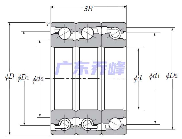 | 滾珠絲杠用三列推力角接觸球軸承 - DBT配對,開式,兩排承受軸向載荷 - 尺寸 | |