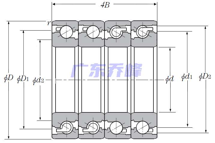 | 滾珠絲杠用四列角接觸推力球軸承 - DTBT配對,開式,兩排承受軸向載荷 - 尺寸 | |