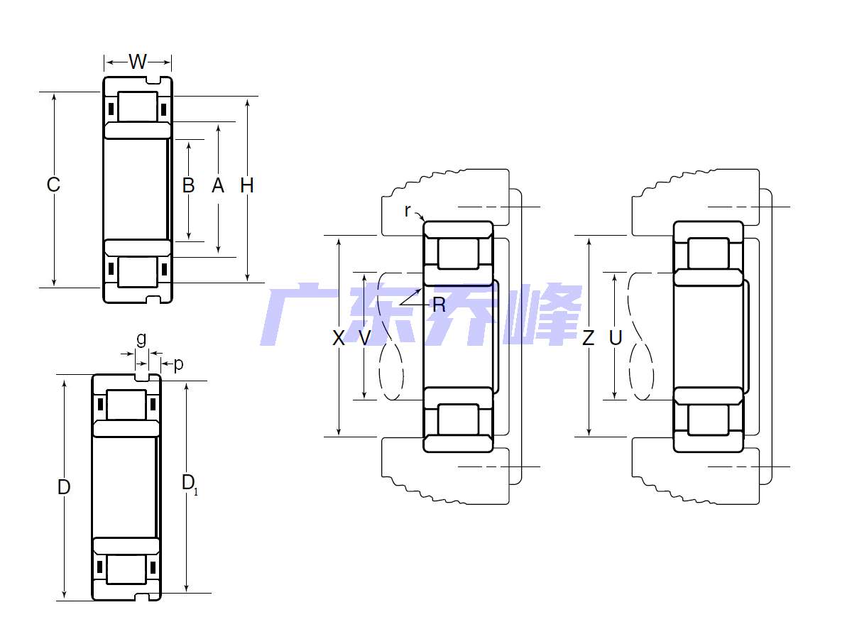 | 圓柱滾子軸承 -可分離型,普通內(nèi)圈,外圈帶兩個加強(qiáng)筋,帶止動環(huán)槽 - 尺寸 | |