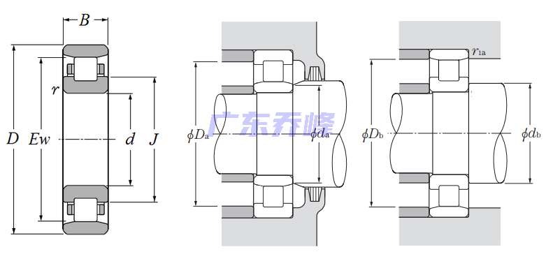 | 圓柱滾子軸承 -內(nèi)圈帶兩個(gè)加強(qiáng)筋,可分離型,普通外圈 - 尺寸 | |