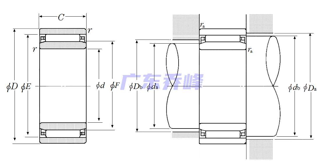 | 機加工滾針軸承 -可分離型型帶內圈 - 尺寸 | |