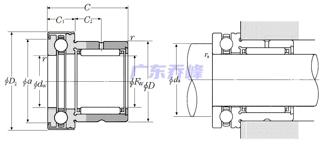 | 帶推力球軸承的滾針組合軸承 -帶端蓋 - 尺寸 | |