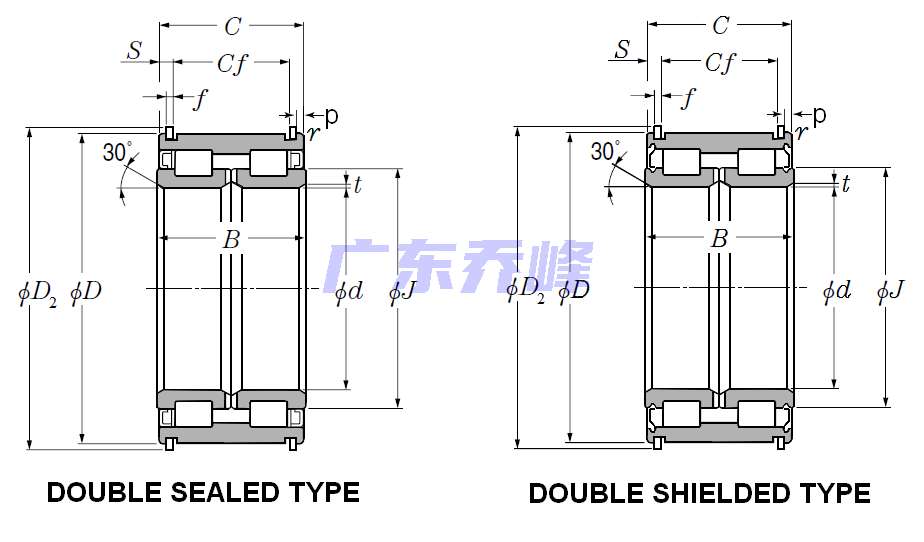 | 滑輪用雙列圓柱滾子軸承帶止動環(huán) - 尺寸 | |